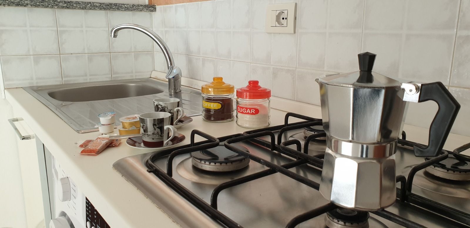 In ingresso la zona cottura con forno microonde, bollitore acqua, piccolo fornetto elettrico e cucina a gas di città, tutto accessoriato con stoviglie necessarie